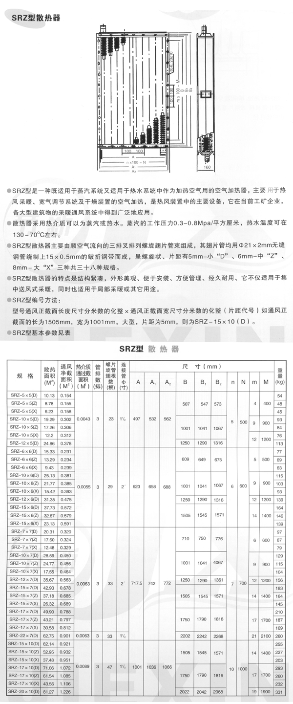 SRZ型散熱器主要用于熱風(fēng)采暖、干燥裝置和熱交換裝置的空氣加熱,空調(diào)系統(tǒng)的加熱段,暖風(fēng)機(jī)的加熱器,工業(yè)建筑、民用建筑蒸汽及熱水(130—70℃)采暖系統(tǒng)。